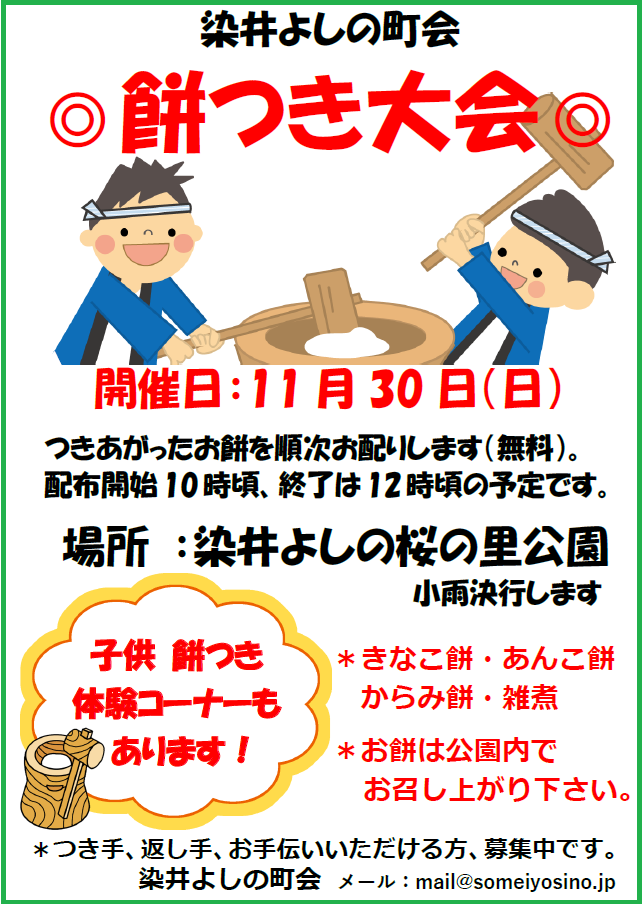 餅つき大会は毎年11月の最終日曜日に開催しています。