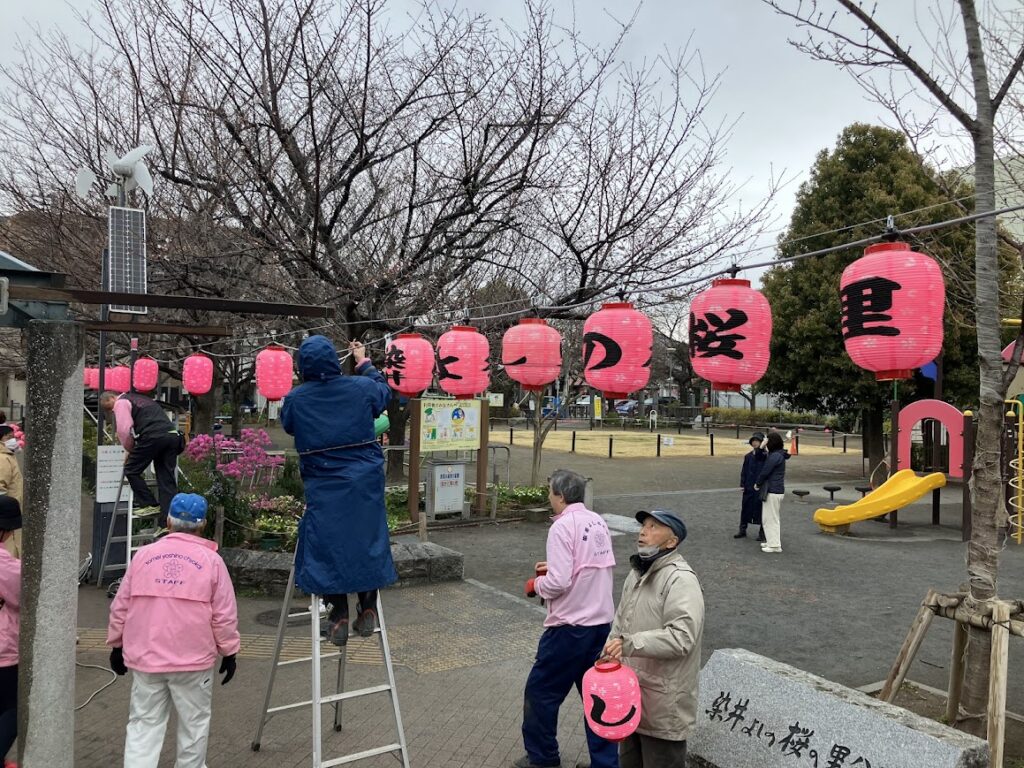春分の日の今日は、小雨と寒さの生憎の天候でしたが、20名の方々と提灯と幟旗の設置を行いました。
